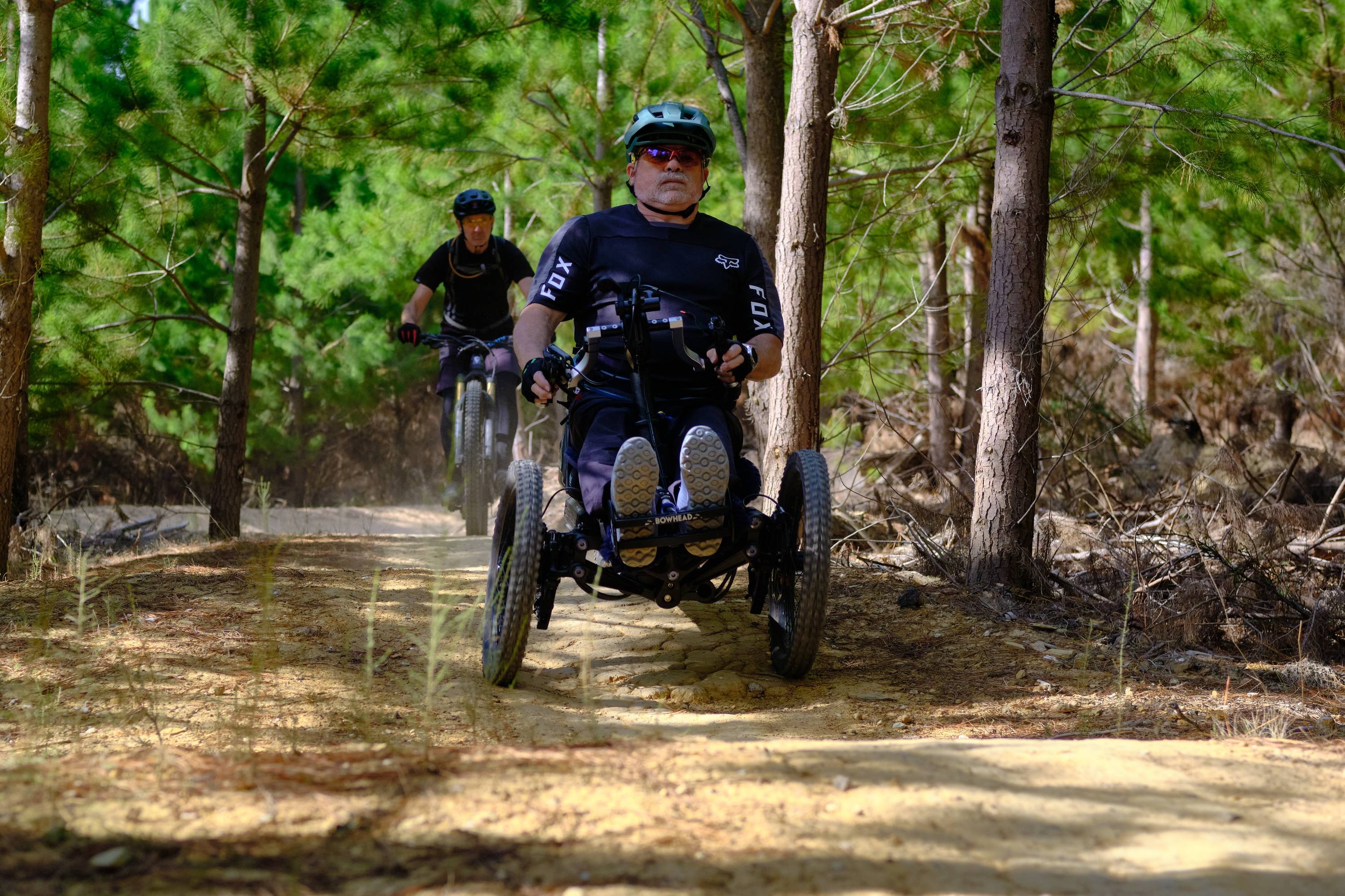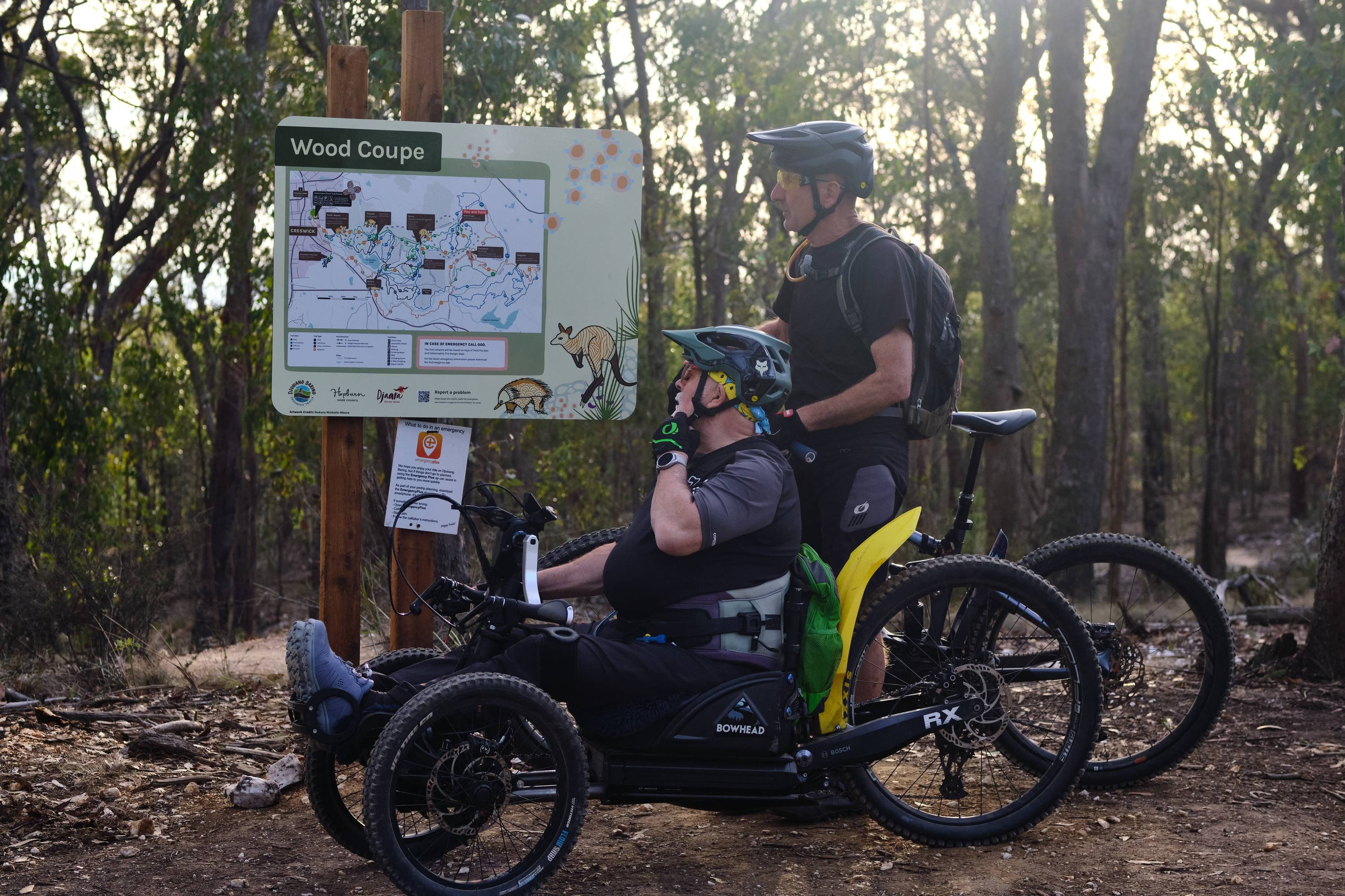 I’ve visited the Djuwang Baring trails before and was excited to return to learn more about the adaptive trails. 30% of the trails here are adaptive, designed to be ridden on adaptive mountain bikes, known as aMTBs. These low-slung, three-wheeled weapons tear up the beautiful, wide flow trails through the pines and scattered gum trees, but they’re not all easy! There are some proper gnarly and challenging gravity trails in the mix.